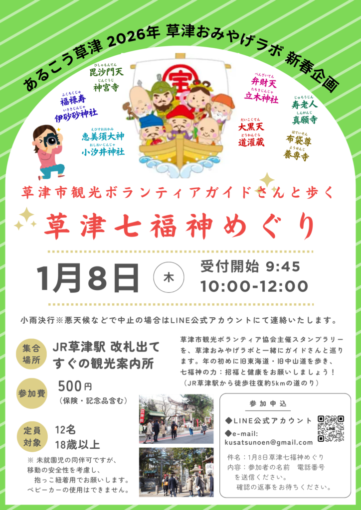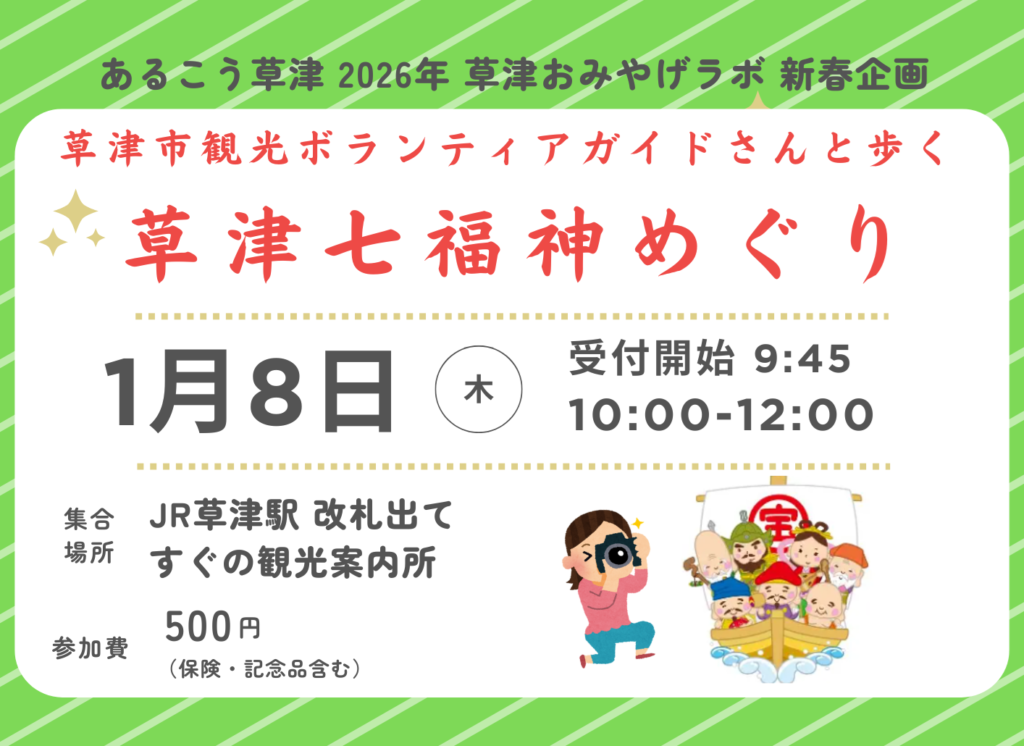 草津市観光ボランティア協会主催スタンプラリーを草津おみやげラボと一緒にボランティアガイドさんと巡ります。年の初めに旧東海道・旧中山道を歩き、七福神のチカラを受け招福と健康を願いましょう(JR草津駅から約5km道のり)
